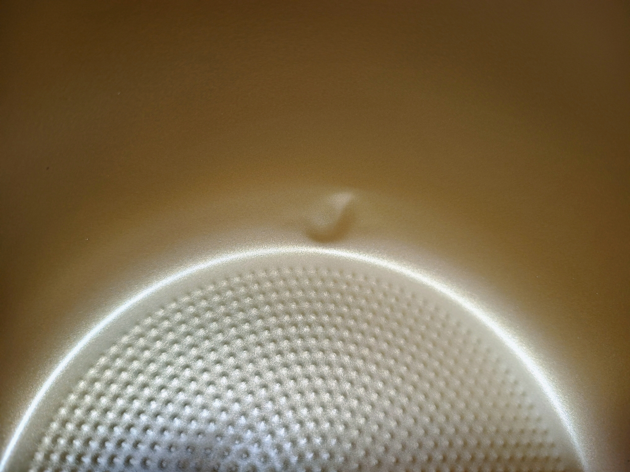 Чаша имеет небольшие дефекты транспортировки. Это не сказывается на свойствах чаши в целом. Общая геометрия чаши и её антипригарные свойства не нарушены.